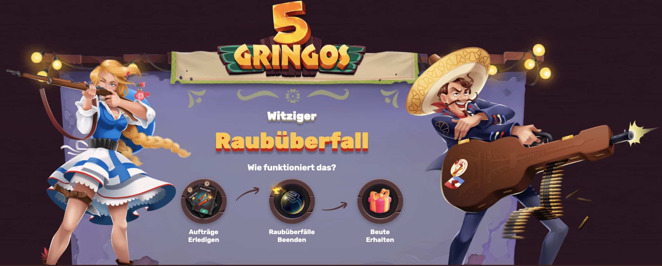 5Gringos Casino entführt Glücksspieler mit der neuen Spielothek im mexikanischen Design, zahlreichen Promotionen und vielen Spielautomaten in eine andere Welt. Als neuer Kunde wird man beispielsweise mit einem Willkommensprogramm bis zu 1000 € begrüßt.